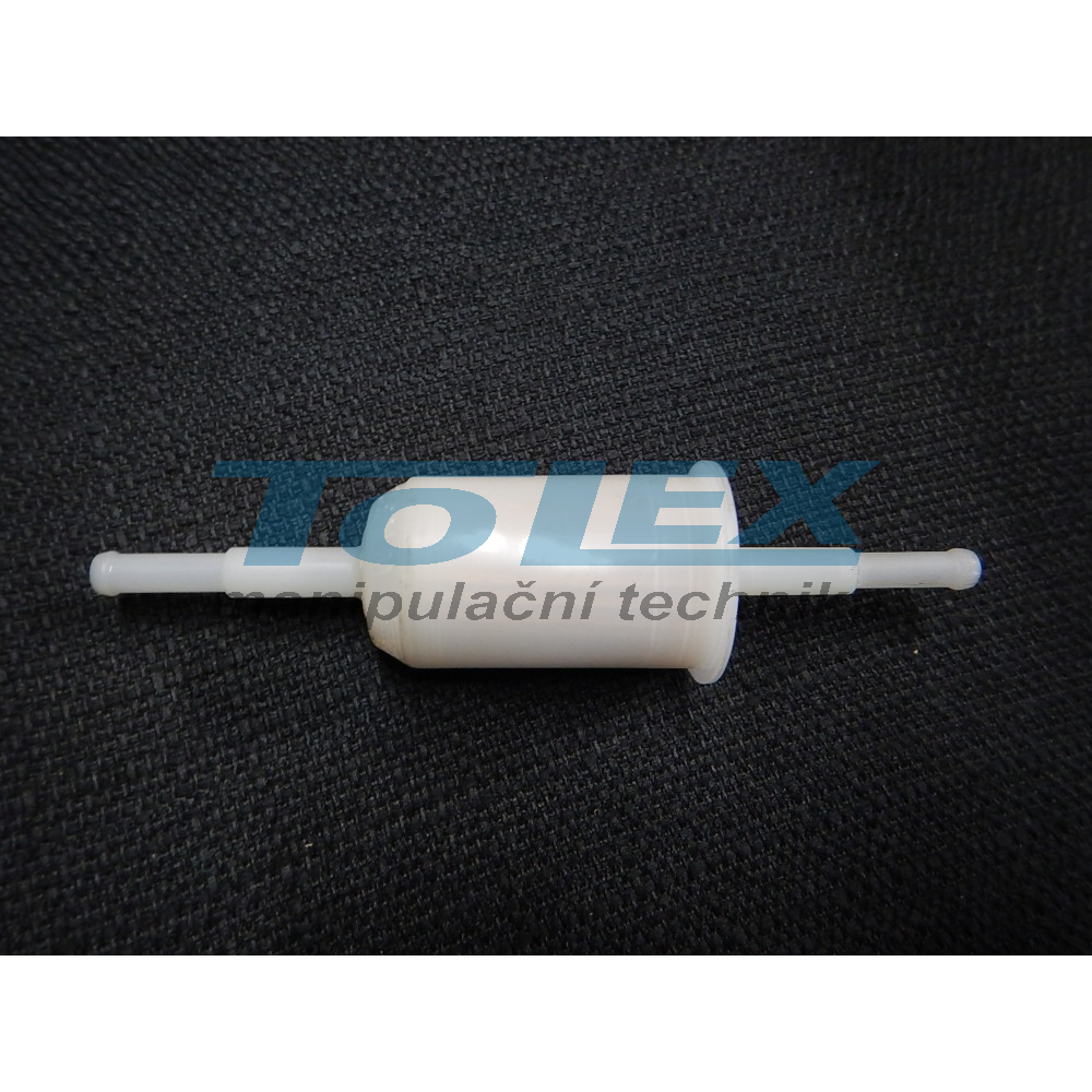 benzínový průtokový filtr pro montáž na palivovou hadici, rozměry: celková délka: 145mm, menší průměr na hadici 6mm, větší průměr na hadici 8mm, průměr filtrační nádobky 32mm