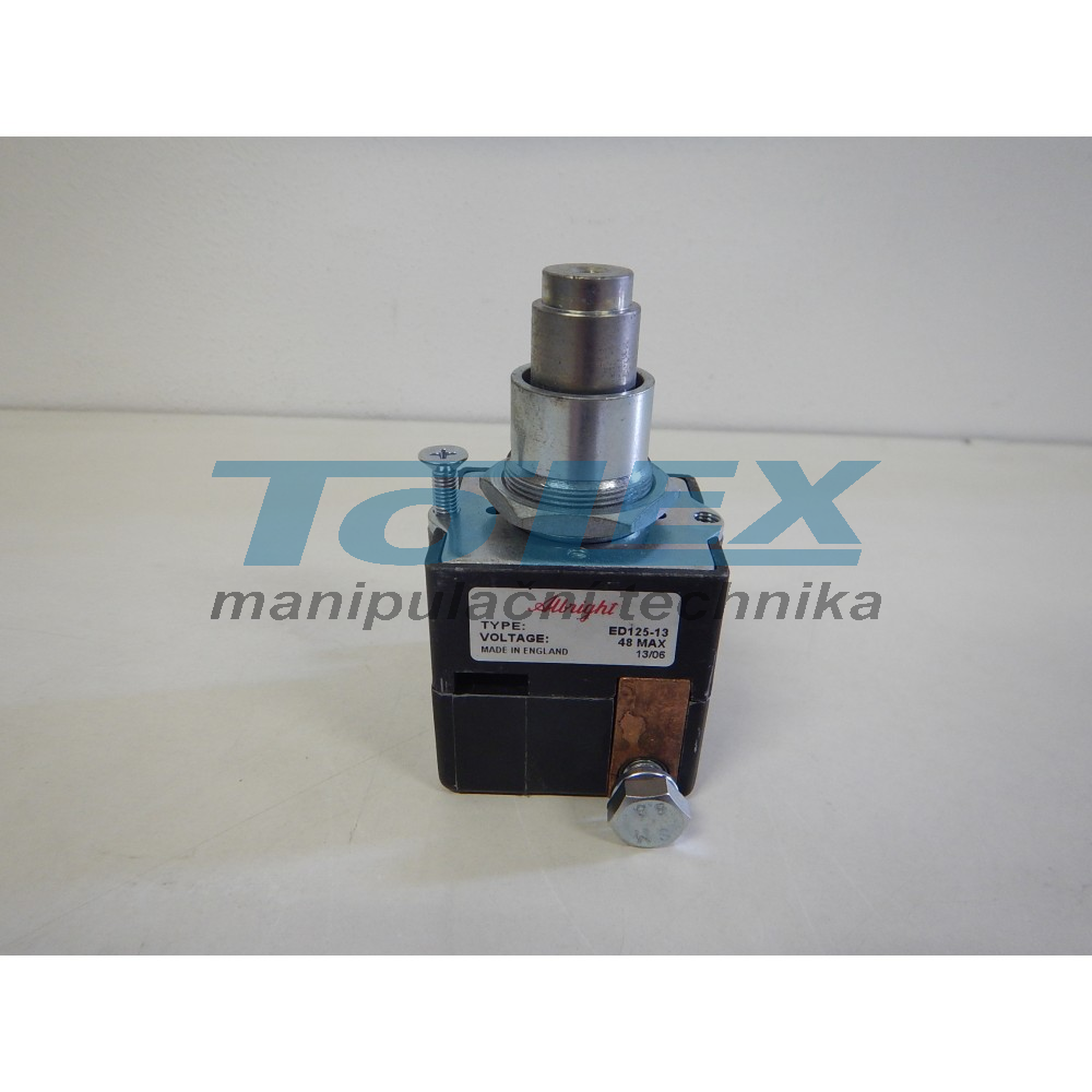 vysokonapěťový bezpečnostní spínač pro odpojení baterie, použití ve vozících Jungheinrich, typ ED125-13, max napětí 48V, max proud 125A, rozměry: celková výška při vytažení 100mm "ON", celková výška při zamáčknutí 94mm "OFF", šířka 43mm, délka 55mm, 2 x připojovací kontakt šroub M8