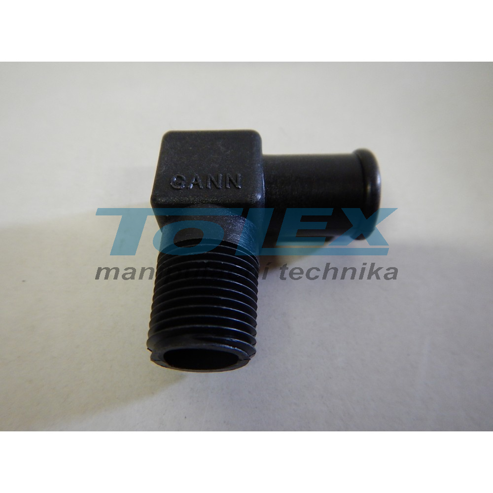 univerzální plastové kolínko (pod úhlem 90stupňů) pro LPG systémy (rozměry: vnější průměr pro hrdlo hadice 16mm, vnitřní průměr otvoru 11mm, celková výška 42,5mm, závit 3/8 NPT x 5/8-90)