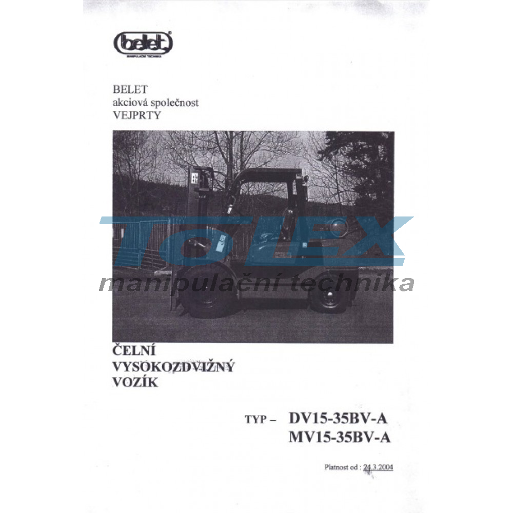 univerzální návod k použití v českém jazyce pro čelní vysokozdvižný vozík Belet typ: DV15-35BV-A, MV15-35BV-A, návod je v tištěné podobě