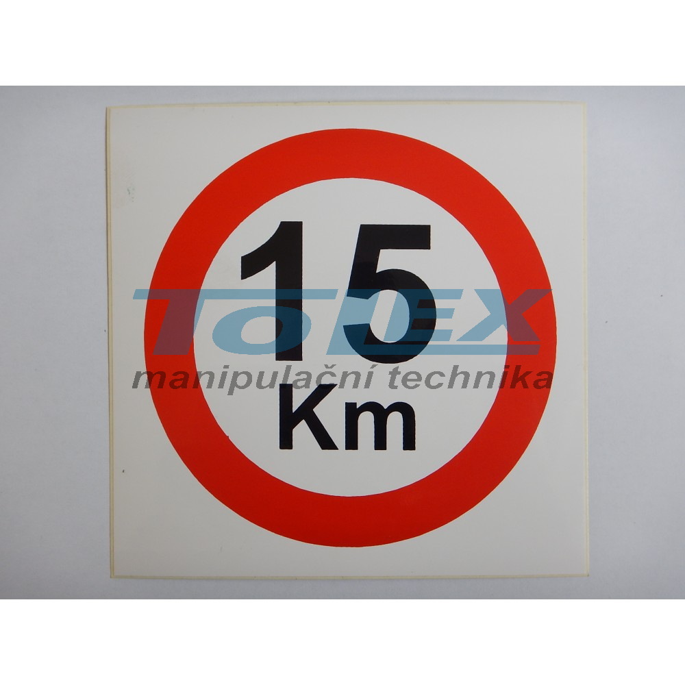 samolepící symbol "maximální rychlost 15km", rozměry: 130 x 130mm, průměr kruhu symbolu 110mm, materiál: bílá lesklá samolepící folie s dvoubarevným lesklým potiskem