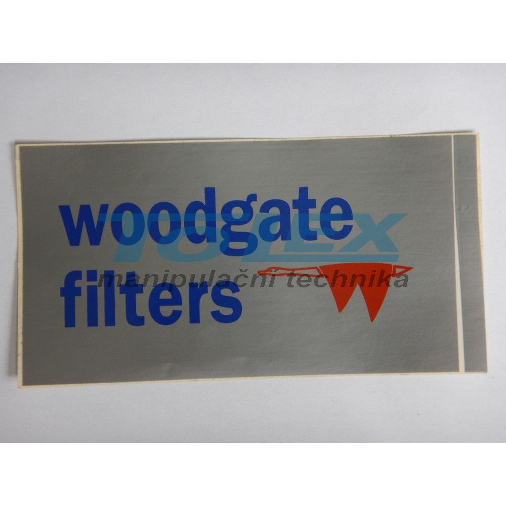 samolepící symbol označení filtru "woodgate filters", rozměry: 105 x 60mm, materiál: šedá samolepící folie s dvoubarevným potiskem
